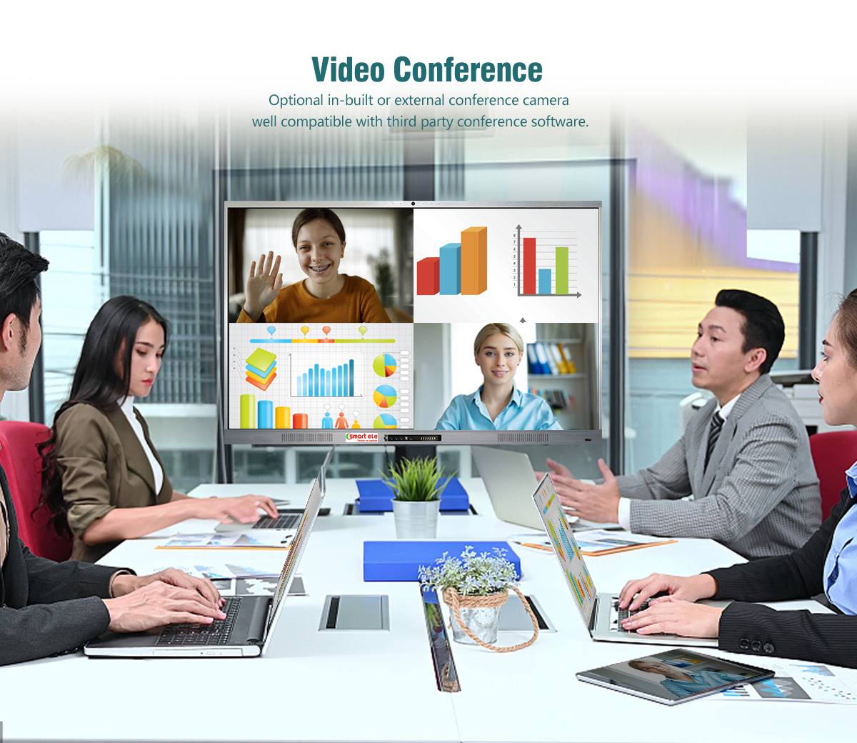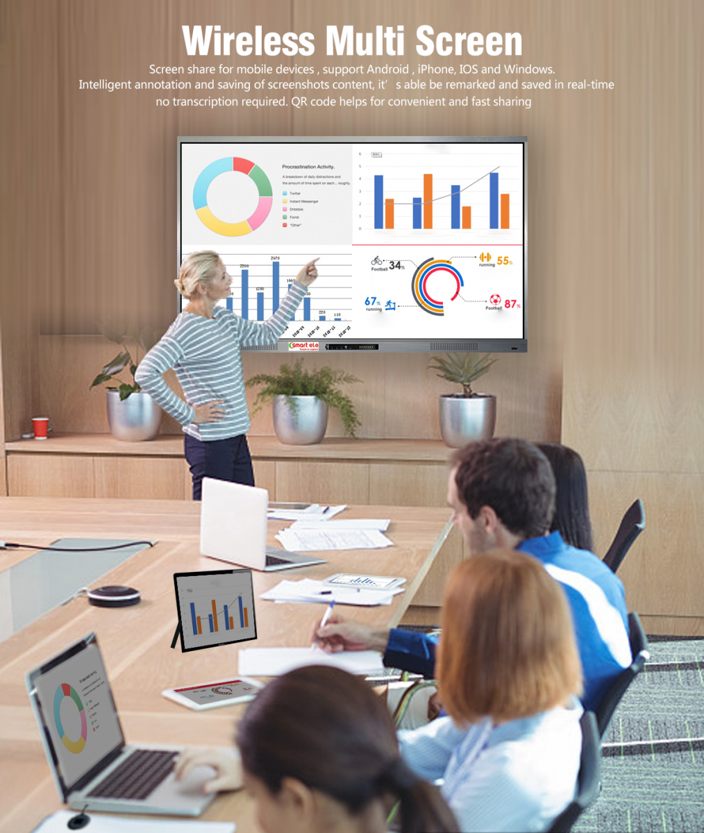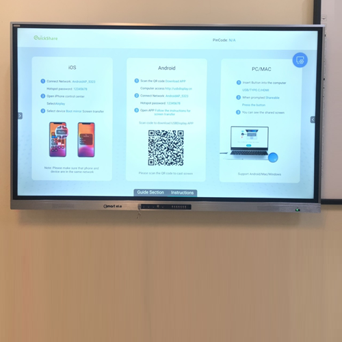 Screen Share cho phép người dùng chia sẻ và nhận nội dung từ mọi nền tảng thiết bị, hỗ trợ Chrome, iOS, Mac, Android và Windows (máy tính xách tay cần có máy chiếu màn hình tùy chọn). Nhiều người dùng có thể đồng thời truyền và chia sẻ nội dung đó trên màn hình Smart ele . Truyền nhiều màn hình cho phép hiển thị tối đa bốn màn hình khách trên màn hình Smart ele cùng một lúc.