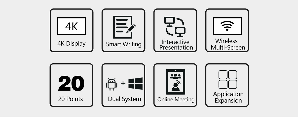 Nhờ công nghệ cảm ứng siêu mịn, màn hình tương tác này mang lại trải nghiệm viết tay siêu mượt mà, tự nhiên. Cảm ứng 20 điểm cho phép nhiều người dùng đồng thời viết hoặc vẽ trên bề mặt màn hình bằng bút cảm ứng hoặc ngón tay của họ hoặc cả hai cùng một lúc. Hỗ trợ hai đầu bút cho phép người dùng đồng thời viết hoặc vẽ với hai màu sắc khác nhau.